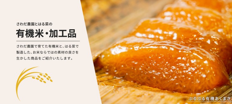 「さわだ農園」で育てた環境保全に配慮した水田でできる有機米と、加工部門「はる菜」で製造した、お米ならではの素材の良さを生かした商品をご紹介します。